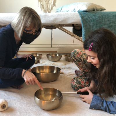 Ensuite, le massage se déroule allongé.e sur une table de massage confortable, habillé.e et sans chaussure. Les bols chantants sont joués autour de l’enfant et directement sur son corps.